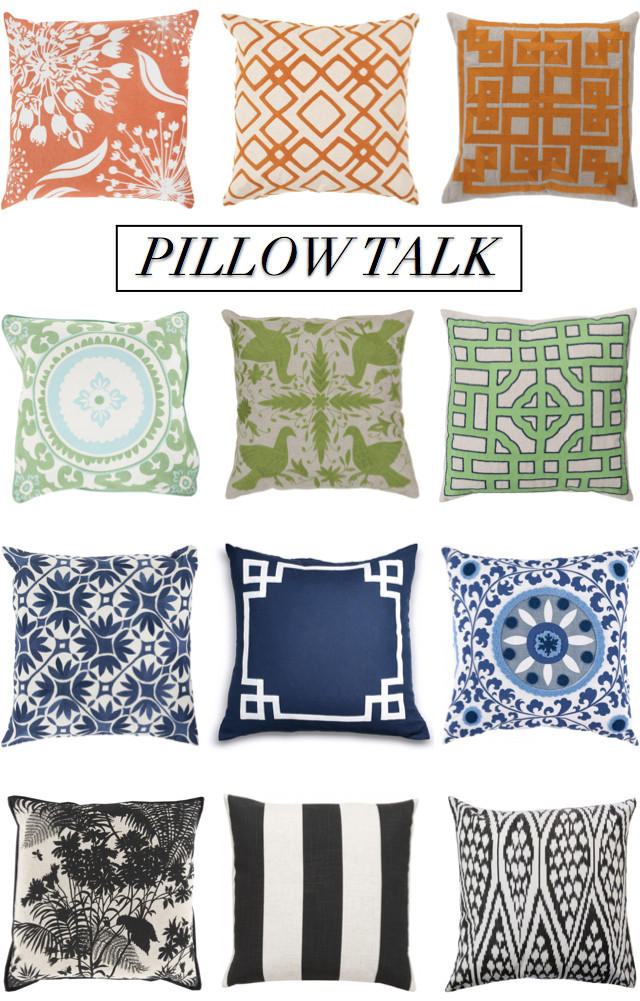 I've been trying to figure out a pillow scheme for the bedroom, as in I have literally have shamless pillows on the bed for weeks. The rest of the rooms is essentially white; I did a DIY headboard with white linen and silver nailhead trim (I'll share someday), white curtains and the walls are the faintest, faintest gray. I am not really a pink person for bedrooms, so that has led me down a blue/green/black/gray path. I'm now considering that orangey-persimmoney color too! I love the idea of mixing a solid and a print or two prints in the same color family. Part of me would just stick with all-white-everything and pretend like I live in a spa. I'm also really prone to the Greek key---I already have two sets of this guy in two colors; I wish I could find it in a Kelly green. How doth one decide???